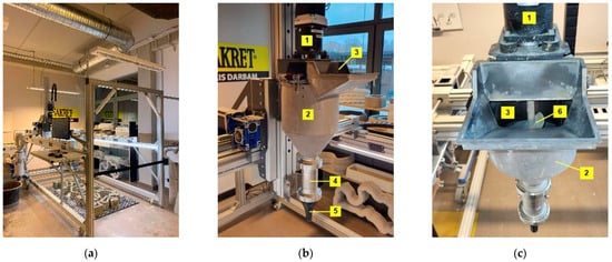 Custom-made laboratory concrete printer at Riga Technical University (RTU): (a) the printer set up with the aluminum frame and print area; (b) the printhead closeup; and (c) the hopper. Labeled parts: 1—motor; 2—hopper, 3—inlet; 4—pipe; 5—nozzle; and 6— helix screw conveyor.