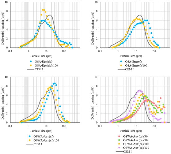 - The size of the OSA-Ees(nid) particles is, on average, somewhat <10 μm and, overall, this ash is finer than CEM I, even before the pretreatment. Milling at 100 Hz only reduces the particles >10 μm, thus increasing the peak in the PSD curve at ~6 μm from ~6 to ~8 wt%;