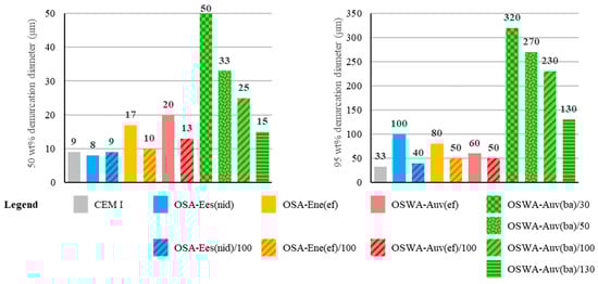 The PSDs of OSA before and after pretreatment with collision milling are collated in Figure 4 as differential passing curves and in Figure 5 as 50 and 95 wt% demarcation diameters. The latter is the diameter at which either 50 or 95 wt% of the particles are smaller than the stated value. The results for cement CEM I are added for comparison. Out of the three types of fly ash, namely, OSA-Ees(nid), OSA-Ene(ef), and OSWA-Auv(ef), the first one is the finest with the peak in differential particle size curve at ~6 μm, while the latter two peak between ~30 and 50 μm. When comparing these three types of ash to their milled counterparts, namely, OSA-Ees(nid)/100, OSA-Ene(ef)/100, and OSWA-Auv(ef)/100, the differential curves indicate that collision milling at 100 Hz predominantly reduces particles larger than 10 μm so that in case of the latter two, the peak is shifted to between ~10 and 20 μm. In the case of OSA-Ees(nid)/100, the peak remains at ~6 μm; however, the percentage passing increases from ~6 to ~8 wt%. This is also reflected in the demarcation diameter of OSA-Ees(nid)/100. Namely, the 50 wt% demarcation diameter remains approximately the same at 8–9 μm, whereas the 95 wt% one is reduced from 100 to 40 μm. Comparison to CEM I shows that OSA-Ees(nid) is finer than cement already in its original condition, while in the case of OSA-Ene(ef) and OSWA-Auv(ef), collision milling at 100 Hz reduces the particles closer to the CEM I distribution.