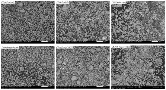 The results of SEM are summarized in Figure 6 and Figure 7, where a heterogenic distribution of particles is observed in all types of ash. The particles that are similar to cenospheres found in fly ash from coal power plants, having a smooth surface and dimensions up to 30 μm, are abundant in OSA-Ees(nid), while in OSA-Ene(ef), only a few are found. The morphology of the two types of ash collected at the electrostatic filters, namely, OSA-Ene(ef) and OSWA-Auv(ef), is predominantly angular with a rather smooth texture.