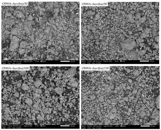 Scanning electron microscope (SEM) images of ash particles. Notation: ash OSWA—oil shale + wood ash; power plant: Auv—Auvere; ash extraction method: ba—bottom ash; collision milling frequency on a Desi-11 disintegrator: 30, 50, 100, 130 Hz.