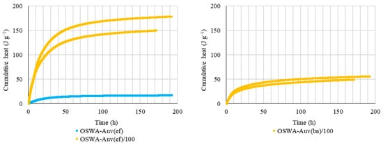 The chemical reactivity was assessed with isothermal calorimetry following the procedure suitable for the SCMs. The procedure specified in the ASTM C1897-20 [] standard detects hydraulic and pozzolanic reactions, which are exothermic by nature. Thus, the amount of released heat is the measure of reactivity. One specimen of 10.00 g was used for the analysis. It was collected from the bag by scooping. The specimen was combined with 30.00 g of calcium hydroxide, 5.00 g of calcium carbonate, and 54.00 g of potassium solution and mixed for 3 min to obtain a smooth paste. A test portion of 15 ± 0.01 g of the paste was placed into a glass ampoule. The ampule was inserted into the TA Instruments calorimeter TAM Air 8, where distilled water was used as the reference material. The measurements were conducted over seven days at a temperature of 40 °C. The cumulative heat of hydration HSCM (J kg−1) stated as heat released per unit mass of SCM in the test portion was calculated.