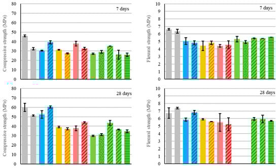 The choice of fixing the spread by adjusting the water and superplasticizer content was made because printability is the principal parameter in this study. As a result, the water–powder ratio is not fixed, which may have a bearing on the mechanical properties. However, printable formulations need to be cohesive, and to achieve this, a high powder content with a sufficient amount of water to wet the particles is required. The water requirement depends on particle size, morphology, texture, and mineralogical composition.