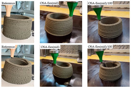 Based on the mechanical test results, two ash-containing formulations, namely, OSA-Ees(nid) and OSA-Ees(nid)/100, were selected for the printability assessment tests. The results, including the reference formulation, are collated in Table 8. These results show that the density of the reference and OSA-Ees(nid) formulation does not differ significantly (~15 g per 1 L of material), whereas the difference is more pronounced for OSA-Ees(nid)/100 (~100 g per 1 L of material). Since the milling of this ash increased the proportion of particles around the 10 μm mark, it may have improved particle packing.