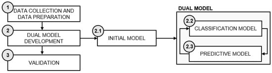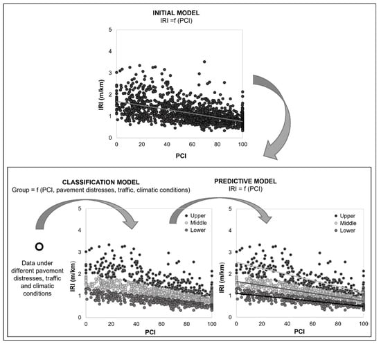 Once the sample was segmented, the training data were used to develop the dual model (Figure 2, where the arrows correspond to the steps followed in the dual model development process). First, a linear regression was applied to predict the IRI from the PCI, as the only independent variable. Linear regression is a statistical method employed to model the relationship between a dependent variable and one or more independent variables. Essentially, it aims to establish the best-fitting linear relationship to the observed data, aiding in the comprehension of the trend and magnitude of the association between variables []. Then, the data were classified into groups to characterize the phenomenon in a more complete and accurate way. An iterative process was defined to establish the optimal data classification, enabling the development of predictive models with the best possible fit. This process is detailed below: