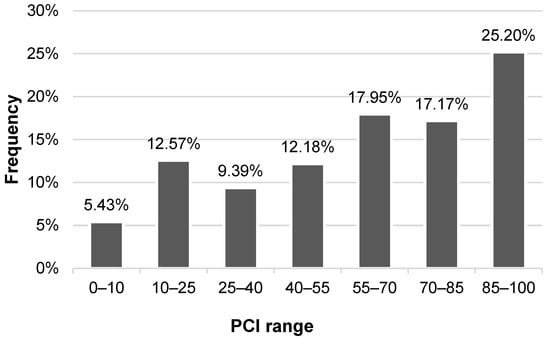 To overcome the limitations of the IRI, additional visual inspections are required, which form the basis of the PCI, a numerical classification system used to evaluate and quantify the pavement condition based on existing pavement distresses. It provides a standardized and objective measure of the quality and levels of deterioration observed in the pavement, allowing its condition to be assessed at both the structural and operational levels []. This index is calculated via the identification and quantification (of both the severity and extent) of 19 types of pavement deterioration, resulting in a numerical value on a scale from 0 to 100, with a higher value indicating a better pavement condition. ASTM International [] establishes levels of pavement condition according to ranges of PCI values. The PCI is a valuable tool for making informed decisions about maintenance, rehabilitation, and resource prioritization in pavement management systems []. It is widely used by transportation agencies, municipalities, and engineering firms to evaluate and manage pavement assets systematically [].