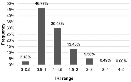 The characteristics of the 2044 individual data points were analyzed in greater detail, taking into account the ranges of the IRI, PCI, and the various types of pavement distresses. Figure 3 shows the distribution of the data according to the PCI ranges defined by ASTM International [], indicating that the data cover all pavement conditions, from PCI 0 to PCI 100. However, it should be noted that no PCI classification is applied in this study; instead, the PCI values are directly employed as a continuous variable for the analyses performed. Similarly, Figure 4 presents the distribution of IRI values, offering insight into the variability of pavement roughness. Table 2 shows basic descriptive statistics for each type of pavement distress. For all pavement distresses, the minimum value and the lower quartile are zero. It can be seen that the most common pavement distresses are non-wheel-path longitudinal cracks and transverse cracks.