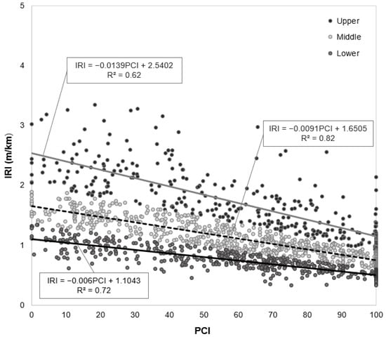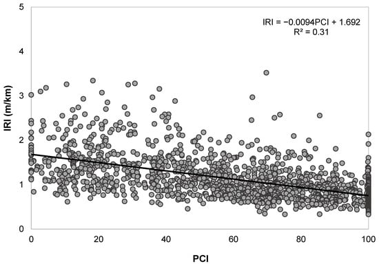 The relationship between the IRI and PCI has been studied extensively, yet significant challenges remain. Many prior studies have focused on predicting PCI values from IRI data [,,], some using large datasets such as the Long-Term Pavement Performance (LTPP) database. However, these models frequently exhibit poor predictive accuracy due to high variability in deterioration conditions. For instance, as highlighted by Piryonesi and El-Diraby [], roads with a perfect PCI score (PCI = 100) can display markedly different IRI values, influenced by factors such as slope, pavement type, and construction quality. To overcome this limitation, other studies have presented models for specific geographical and climatic contexts [,]. These studies have achieved high predictive accuracy within specific contexts but lack generalizability across diverse regions. Hence, a review of the literature suggests that, although there is a relationship between the IRI and PCI, it remains challenging to establish an accurate and universal model that works adequately across different climatic and geographical contexts.