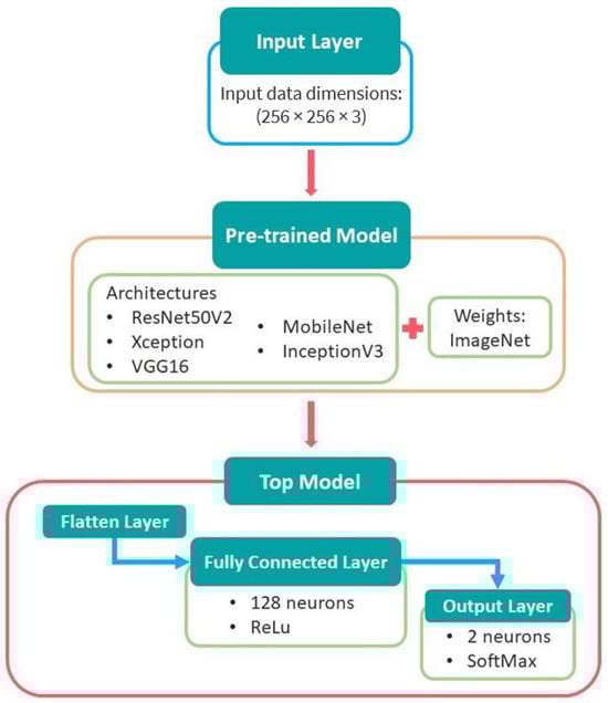 A transfer learning process was performed using the following architectures: ResNet50V2, Xception, VGG16, MobileNet, and InceptionV3. All of these architectures were accessed through the Keras Applications module in Python. The models utilized pre-trained weights from the ImageNet dataset, which are readily available within the Keras Applications module. These pre-trained weights provided a strong starting point for the models, enabling them to leverage prior knowledge and adapt efficiently to the task of railway fault detection.