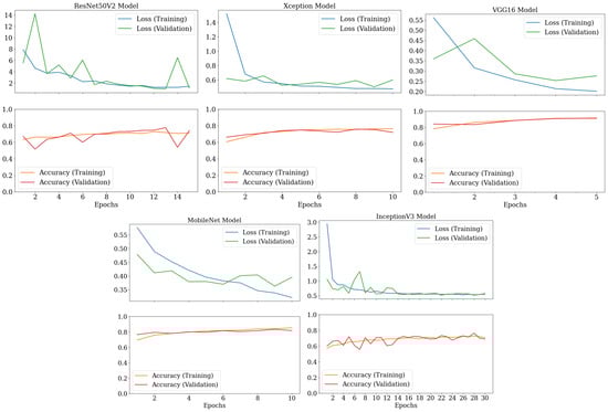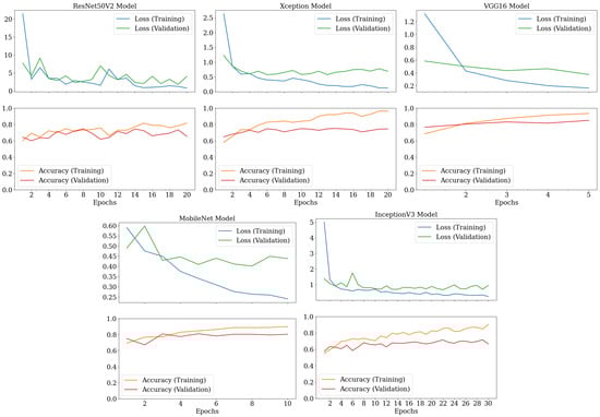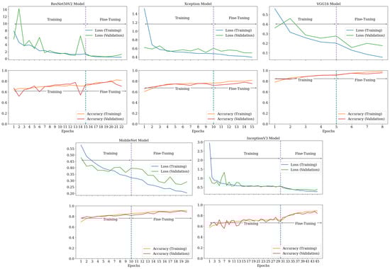 Figure 4 summarizes the learning process of each model from Stage 3. The final values of accuracy and loss recorded at the last epoch for each model are presented in