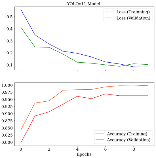 The YOLOv11 model utilized the same base training dataset as the other models analyzed in this research. Despite the differences in the data augmentation methodology, the validation and test datasets remained unmodified, ensuring uniformity in the evaluation process. This consistency allowed for a robust comparison of YOLOv11’s effectiveness against that of the previously evaluated models in terms of both accuracy and computational efficiency.