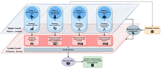 More specifically, the framework considers the coexistence of conventional vehicles and connected vehicles (CVs), represented by three distinct player types: the user equilibrium (UE) player, the system optimum (SO) player, and the Cournot–Nash (CN) player. Each player embodies a unique stakeholder perspective, with varying objectives, strategies, and access to information such as minimizing the individual travel times, optimizing the total network efficiency, or balancing the costs for a specific user base. By focusing on travel time as a simplified representation of generalized cost, the framework models the decision-making dynamics of these players and their interactions within a complex urban network. It accounts for static, public, and proprietary real-time information systems, highlighting the distinct roles of traffic management authorities and private service providers. The concept of the methodological framework is presented in Figure 1.
