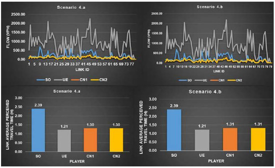 In both Scenarios a and b, where the CN players cooperated, their strategic decisions seemed to involve routing traffic through these specific links to achieve their shared objectives (i.e., congestion management and road safety improvement). The increased number of such links in Scenario b, with higher CN demand, suggests an expansion of the strategic impact of the CN players on the network dynamics. As their influence grows, they may extend their cooperative efforts to additional links, influencing traffic patterns. Figure 2 and Figure 3 present the link flows per player, the link average “perceived cost” travel time per player, and the shifts in the players’ link flows as they evolve in the cooperative game.