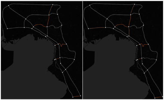 Specific links showcased higher CN flows than SO flows. In Scenario a, this phenomenon was observed in eight network links including three in the west part of the city, two in the central area of the city, and one connecting the airport area with the region of Thermi. Scenario b, characterized by increased demand by the CN players, showed an increased number of such links including one directing traffic from the west part of the city to the outer Peripheral Ring Road and another one connecting the western and central parts of the city.