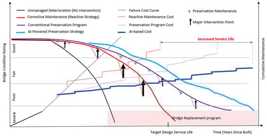 A key strategy for maintaining bridge integrity is preservation, which entails proactive actions to prevent, delay, or mitigate structural deterioration in bridge components [,]. Figure 1 presents a comparative trajectory of bridge condition and corresponding maintenance costs under four distinct management strategies: unmanaged deterioration, reactive maintenance, conventional preservation, and AI-enhanced preservation. In the absence of intervention, structural condition deteriorates rapidly, whereas both reactive and conventional preservation strategies slow this decline but incur escalating maintenance costs due to delayed action. In contrast, the AI-enhanced preservation strategy combines early forecasting with targeted interventions, allowing bridges to remain in good condition for longer while minimizing cumulative maintenance costs. By addressing deterioration earlier, this proactive approach reduces the need for major repairs and postpones the point at which full replacement becomes necessary. This relationship between condition and cost highlights the value of intelligent, data-driven strategies in extending the service life of infrastructure and improving the efficiency of long-term investment planning.