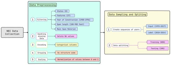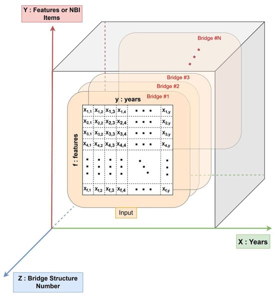 After the Filtering and handling missing data mentioned in Figure 2. The number of bridges were reduced from 30,756 bridges to 5921 bridges to ensure the data quality, characterized by 189,472 reports and 5,115,744 features in total. For model development, the dataset is split into 80% for training and 20% for testing. The input data is structure as three-dimensional matrix, where: