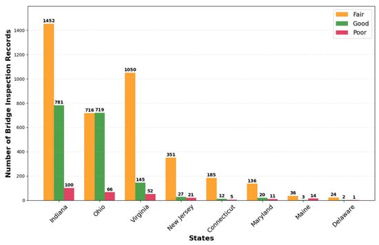 Figure 4 presents the condition ratings of bridges, which are the labels for the predictions concerning the years from 1993 to 2024, across different states, highlighting that the majority are classified as being in fair condition. Without proper maintenance or preservation efforts, these bridges are at risk of further deterioration, potentially reaching a poor condition. This trend underscores the importance of proactive infrastructure management. Additionally, the dataset provides a valuable foundation for analyzing patterns and extracting meaningful insights to support the aim of this research.