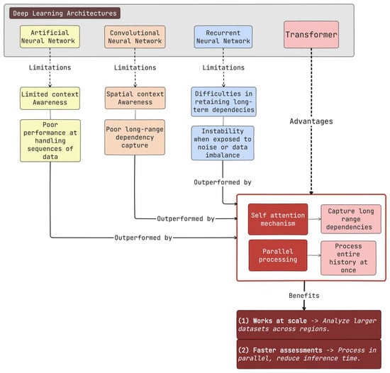 In the world of Deep learning, there are different types of architectures used to make predictions in bridge engineering, depending on the dataset. The ones used on prior research are CNNs, ANNs, RNNs [,,,,,,]. CNNs are known for their strong performance with images and spatial data. However, there are several limitations. They can only “see” small parts of the data at a time, which makes them less effective for understanding patterns over time. Similarly, ANNs, while useful for general prediction tasks, are not good at handling sequences of data. They have trouble remembering long-term patterns. These limitations make both CNNs and ANNs less suitable for tasks that require analyzing long-term trends over time. Meanwhile RNNs process the data sequentially, and due to bridge inspection are performed every 2 years and the condition rating might not vary much unless an unpredictable failure happens, the model does not capture the whole picture of the situation over years.