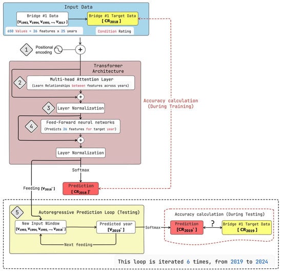 In the testing phase, the model operates in an autoregressive loop to forecast future condition ratings from 2019 to 2024. In each iteration, the model’s previous prediction (e.g., for 2018) is included as part of the input sequence for predicting the next year (e.g., 2019). This new input window again goes through the Transformer to produce a prediction, which is subsequently used as input for the following year. The model repeats this loop six times, one for each year between 2019 and 2024, and compares each prediction with the corresponding actual condition rating to evaluate its performance. By leveraging historical data and autoregressive feedback, the model is capable of capturing long-term trends and temporal dynamics, enabling accurate, year-by-year forecasting of bridge conditions.