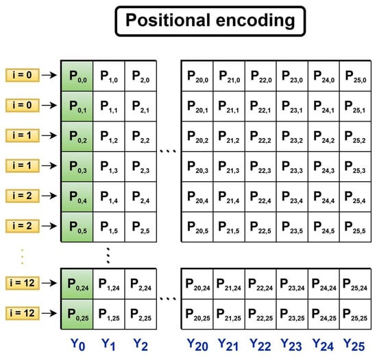 The positional encoding assigns a unique value to each position in the input embedding. It helps to distinguish different positions and aids in learning the sequential nature of the data. The size of position encoding ought to match the input embedding size, so that they can be added together. For each time step (from 0 to 24) and each embedding dimension index from 0 to 12. The positional encoding values shown in Figure 7 are computed using Equation (1).