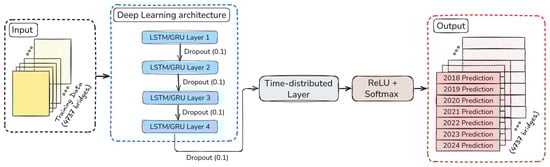 The core of the model consists of a stacked configuration of 4 recurrent layers as stated in []. Each of these layers can be implemented using either LSTM or GRU architecture. Moreover, to mitigate overfitting, a dropout regularization technique with a rate of 0.1 is applied after each of the four recurrent layers as shown in Figure 8. The recurrence is defined as , where denotes either the LSTM or GRU function.