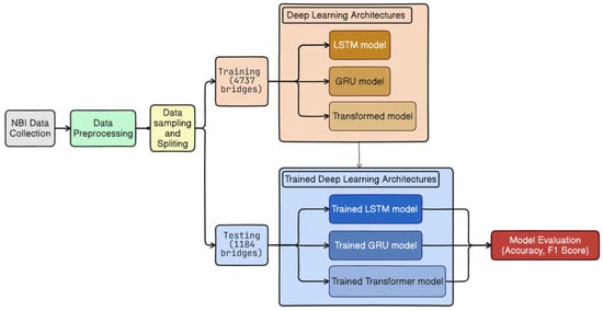 Given these challenges, a transformer-based framework has been proposed, inspired by NLP to model bridge condition assessments as structured temporal sequences [,]. Unlike Recurrent neural network (RNN)-based models, Transformers employ a self-attention mechanism that enables them to capture dependencies across all timesteps simultaneously. This allows for more accurate long-horizon forecasts and improved detection of underrepresented deterioration states. Consequently, the proposed Transformer-based framework addresses critical gaps in the state of the art by offering a more reliable, interpretable, and comprehensive tool for predicting bridge condition ratings as depicted by []. Moreover, while most existing machine and deep learning approaches have been trained using the National Bridge Inventory (NBI) dataset, they typically focus on specific regions only. This introduces a further research gap: the need for models that are adaptable and robust across diverse geographic and climatic conditions.