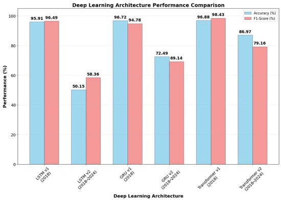 Interpreting the results in light of the strong persistence of bridge condition ratings, a natural concern is that high accuracy might be achievable by a trivial “no-change” classifier. However, Figure 10 indicates genuine predictive skill, particularly for the Transformer. In the short-term setting (v1, 2018), all models achieve high accuracy, yet the Transformer is best (96.88%) and simultaneously yields the highest F1-score (98.43%), surpassing the LSTM (95.00% accuracy; 96.49% F1-score) and GRU (96.72% accuracy; 94.78% F1-score). Because F1-score jointly reflects precision and recall, these results show that performance does not arise from simply reproducing stability; rather, the Transformer more reliably captures rare deterioration events while still recognizing prevalent steady periods. This is consistent with its self-attention mechanism, which integrates extended histories and contextual covariates to differentiate, for example, a bridge that has remained at Condition 7 for two versus ten years, thereby adjusting risk for imminent downgrades.