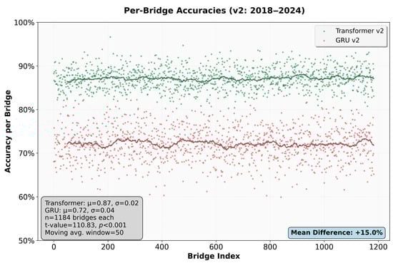 To evaluate whether the performance difference between the two best models for long-term prediction (Transformer v2 and GRU v2) was statistically significant, a paired t-test was conducted on the bridge-level accuracies using the testing data, conformed by 1184 bridges (2018–2024), as illustrated in Figure 11. The scatter plot shows per-bridge performance, where each point represents the accuracy achieved by a model on a specific bridge. The Transformer v2 (green points) consistently outperformed the GRU v2 (red points) across nearly all bridge indices, achieving a higher mean accuracy (86.97% vs. 72.49%) and demonstrating a substantial 15%-point improvement. Moreover, the Transformer exhibited lower variability (σ = 0.025) compared to the GRU (σ = 0.040), indicating more consistent performance across different bridge structures. The 50-point moving average trend lines (darker green and red) further reveal that both models maintain stable accuracy throughout the dataset, with no systematic degradation based on bridge ordering. Importantly, statistical testing confirmed that this performance gap is highly significant (t = 121.63, p < 0.001), underscoring that the superiority of the Transformer is both statistically and practically meaningful for long-term bridge condition forecasting.