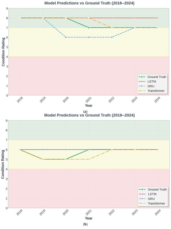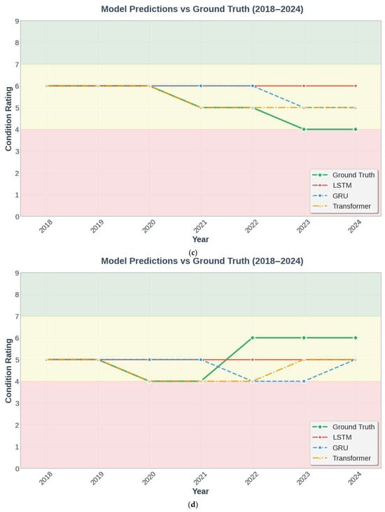 To provide a clearer visualization of model performance, Figure 12a–d presents a comparative analysis of predicted bridge condition ratings against their ground truth values for four representative bridges over the 2018–2024 period. Specifically, each subplot corresponds to an individual bridge, juxtaposing the actual data with the forecasts from the LSTM, GRU, and Transformer models. These plots effectively illustrate how each architecture uniquely captures deterioration patterns and recovery trends. For instance, the Transformer model consistently aligns more closely with the ground truth across multiple cases, demonstrating superior accuracy. In contrast, the GRU model often underestimates sudden changes in condition. Furthermore, the LSTM model shows a notable weakness in long-term prediction, as its forecasts tend to plateau and remain static over several years. In practice, this behavior indicates that the LSTM is effectively acting as a “no-change” predictor, reproducing the most recent observed value rather than adapting to future variations.