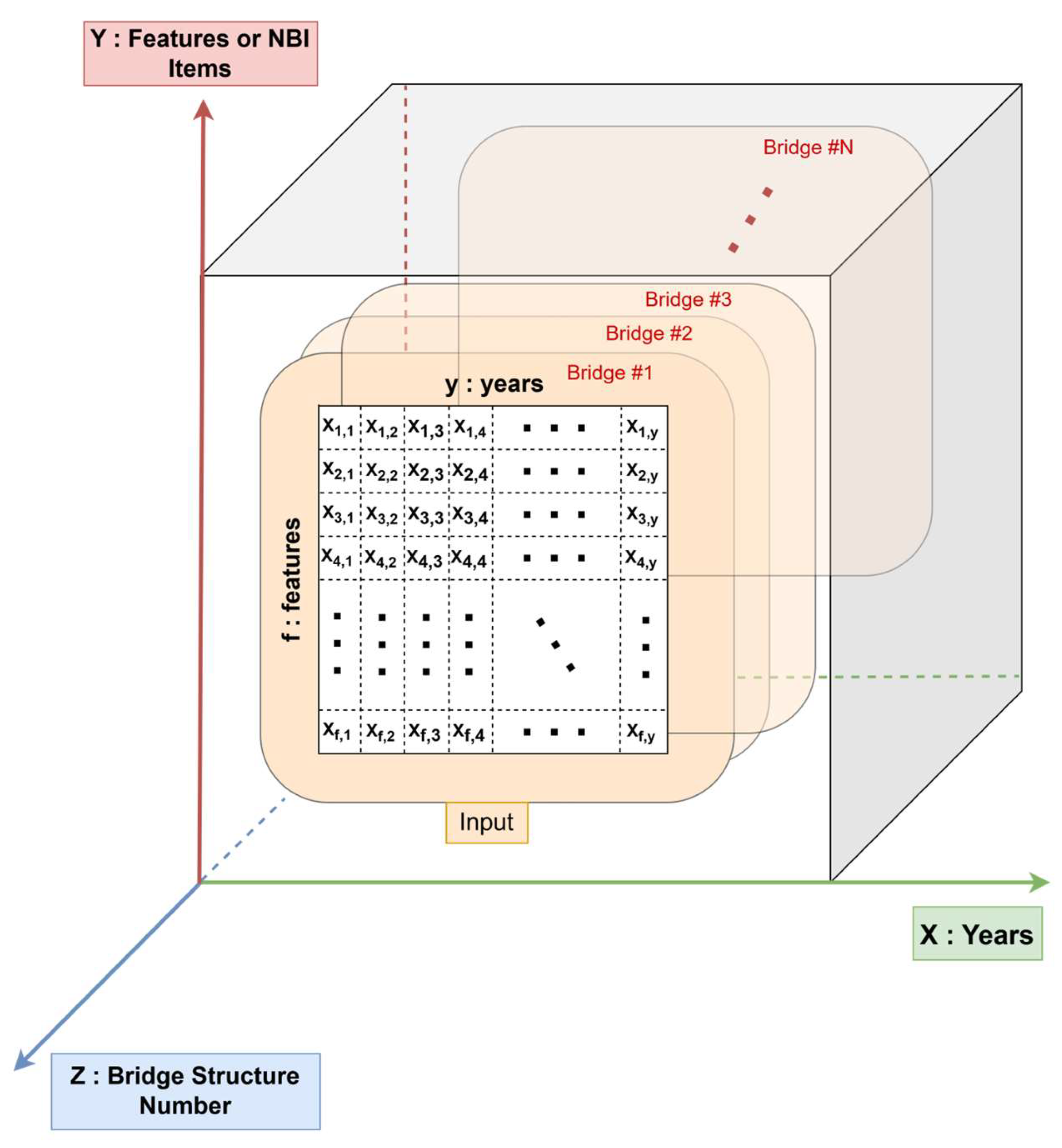 - The Z-axis represents each bridge structure, effectively organizing the dataset as set of independent structures.