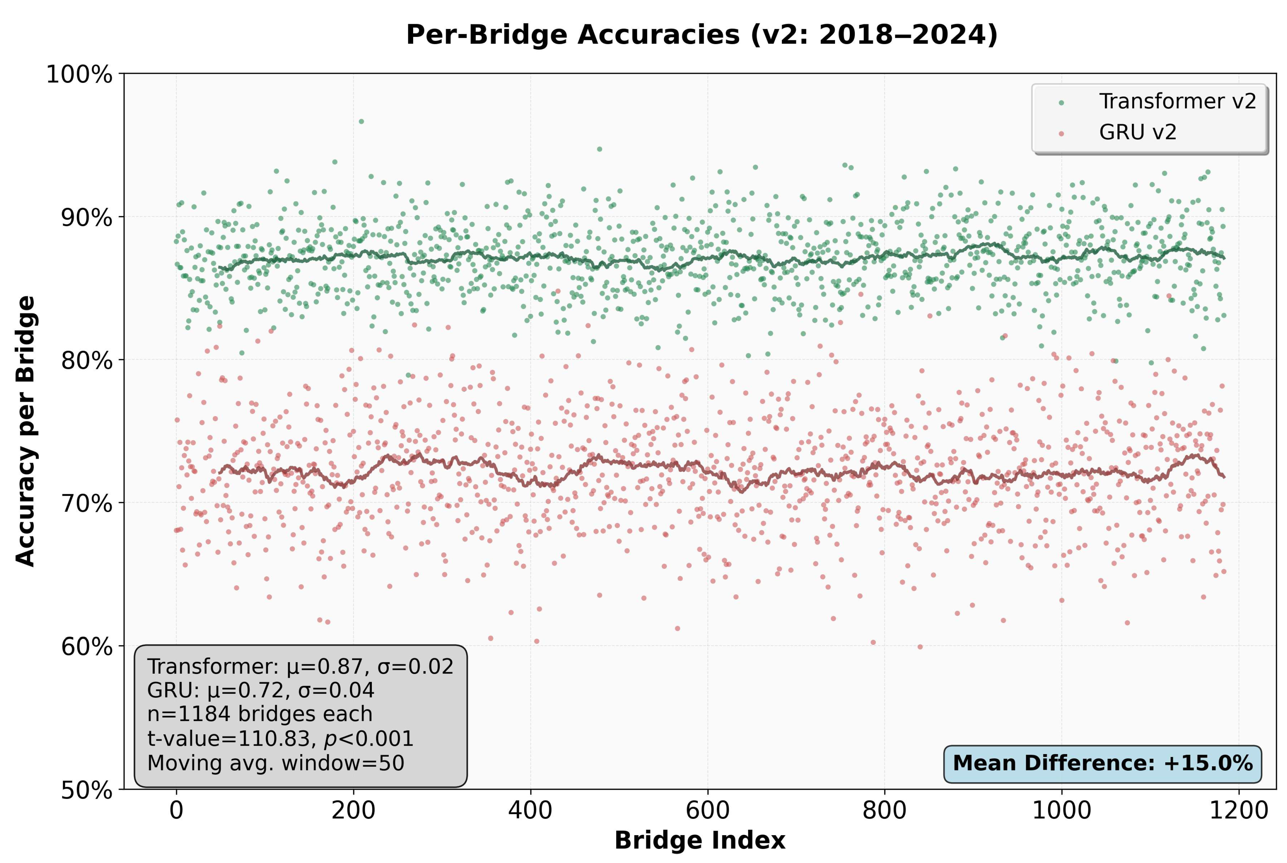 - How can the proposed Transformer architecture surpass the accuracy of bridge condition rating predictions compared to models such as LSTM and GRU with time-distributed layers?