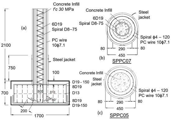 Three full-scale spun pile connections strengthened with a steel jacket were prepared to evaluate their seismic performance. The comprehensive discussion and results were reported []. The specimens SPPC05 was an empty spun pile, SPPC06 was filled with concrete, meanwhile SPPC07 had reinforced concrete infill. The steel jacket was a 0.7 mm thick cold-formed steel plate that was bent to match the diameter of the spun pile. Rivets were utilized to connect the ends. The height of the jacket was 850 mm, which was equal to the length of the concrete crack damage on the spun pile of the first series testing.