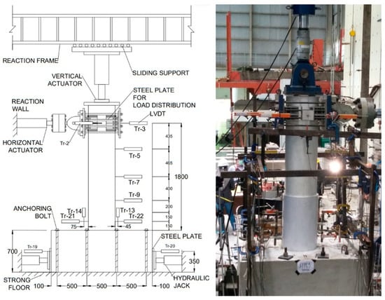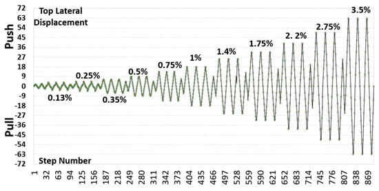 Figure 2 presents the test setup. The specimen was attached to a strong floor with 10 anchoring bolts. Seven transducers were installed to measure the horizontal displacement of the spun pile, and two transducers were aimed to measure the vertical displacement. The movement of the pile was captured by another pair of transducers (Tr-19 and Tr-20). The specimens were tested following the loading protocol specified by ACI 437-07 as shown in Figure 3. The targeted drift was 3.5%. A constant vertical load of 500 kN, which was equal to 0.1 f’cAg, was applied. The axial load level reflects practical conditions, as design typically limits the loads on piles to the range of 0.1–0.2 f’cAg. The use of this conservative value is consistent across most experimental studies on spun pile–pile cap connections [,,]. The jack was attached to a sliding frame to ensure the verticality of the load. The test was terminated upon reaching the target drift or a strength degradation exceeding 50%, whichever condition occurred first.