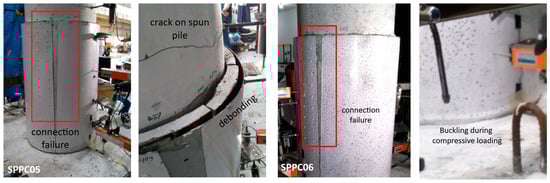 The failure mode of the three specimens is presented in Figure 4 and Figure 5. Specimens SPPC05 and SPPC06 failed earlier due to the detachment of the steel jacket connection at a drift of 1.75%. The placement of the steel jacket connection on the spun pile was not purposely arranged. For SPPC05 and SPPC06, the connections are located approximately 30 degrees from the horizontal load path. Once the connection of the steel jacket failed, debonding occurred between the jacket and the grout as well as between the grout and the spun pile, as shown in Figure 4. The debonding breaks forth from the farthest part of the pile cap surface and spreads downward. When the connection began to fail, the confinement from the steel jacket was revealed to be still effective on the lower side. Therefore, the failure of the steel jacket did not result in a sudden loss of strength in the connection, as can be seen on the hysteretic curves presented in Figure 6a,c. Another failure mode observed in SPPC06 was the buckling of the steel jacket next to the pile cap. The buckling indicated that the steel jacket lost the lateral support due to debonding from the grout. Interestingly, fracture of the PC wire was also detected during the testing, indicated by the sound of the bar breaking in all three specimens.
