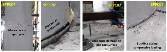 The comparison of three specimens, SPPC05, SPPC06, and SPPC07, is displayed in the envelope curves shown in Figure 6d. SPPC07 shows better performance in terms of strength and energy absorption. SPPC07 has the greatest capacity because it has additional reinforcement bars (6D19), and also the jacket confines the concrete cover of the spun pile throughout the test.
