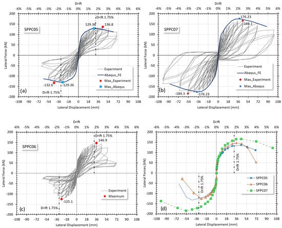 The hysteretic curve of the experimental results: (a) SPPC05; (b) SPPC07; (c) SPPC06. (d) The skeleton comparison of three specimens.