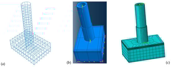 The geometric model of (a) reinforcing bars, (b) pile cap, spun pile, and steel jacket. (c) The FE meshing of the spun pile–pile cap connection.