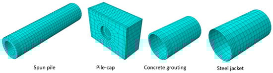 The FE model utilizes C3D8R solid elements for the spun pile and pile cap concrete. It is a three-dimensional (3D) continuum solid element consisting of eight nodes with reduced integration. The concrete infill and its connection to the pile cap use C3D6 elements, which are 3D solid elements consisting of six nodes. The shell element S4R, which consisted of four nodes with reduced integration, was used to model the steel jacket. All reinforcing bars used a T3D2 truss element with two nodes. The geometric model and meshing of spun pile to pile cap connections are shown in Figure 7 and Figure 8.