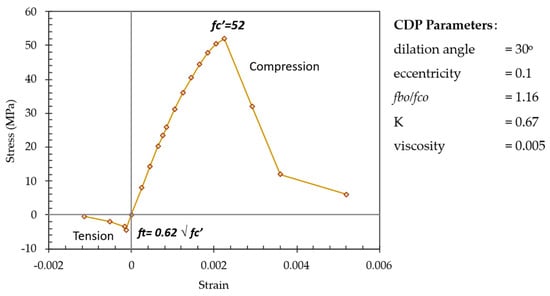 Figure 9 shows the stress–strain curve of concrete in compression and tension used in the FE model. The compression behaviour refer to the Reddiar model, which was a modification of Mander’s concrete model with a post-peak softening phase. The tensile behavior follows the Wahalathantri et al. model [], which is chosen for numerical simplicity and to avoid errors in Abaqus analysis. The tensile strength of concrete is taken as 0.62 √f’c. The Concrete Damage Plasticity (CDP) model is used to simulate the damage in concrete after reaching its maximum strength under both tension and compression. The plasticity parameters used in the FE model are as follows: dilation angle, eccentricity, fbo/fco, K, and viscosity, where their values are 30o, 0.1, 1.16, 0.67, and 0.005, respectively.