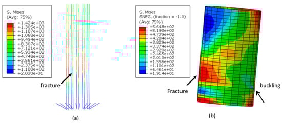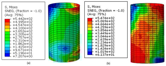 In the FE model, hard contact is used to represent the experimental conditions, where the friction coefficients are set as follows: 0.8 between the infill concrete and the inner surface of the spun pile, 0.5 between the outer surface of the spun pile and the grout, and 0.3 between the grout and the steel surface []. In the fully bonded specimen, it is assumed that the steel jacket is perfectly bonded to the grout, and the grout is perfectly bonded to the spun pile. As observed from the force–displacement curve in Figure 15, perfect bonding enhances the strength of the connection. However, in terms of ductility, partially bonded results in a gradual post-peak strength reduction, leading to better ductility.