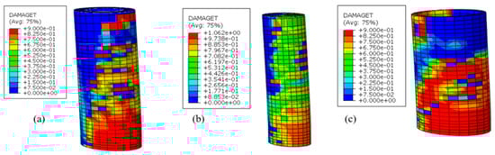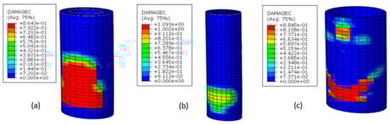A clear discrepancy was found between the FE results and the experimental observations. In comparison, the test showed similar displacement ductility for specimens with and without a steel jacket (3.9–4.0) []. The FE parametric study predicted a significantly lower ductility ratio (2.7–2.9) for the specimen without a steel jacket. This inconsistency highlights the limitation of the FE model, which employed monotonic loading rather than cyclic loading. Monotonic loading accelerates spalling of the concrete cover on the tension side, leading to premature strength loss and reduced ultimate displacement. In contrast, cyclic loading alternates tension and compression, delaying cover spalling and resulting in more gradual post-peak degradation and higher displacement ductility. These findings suggest that the choice of loading scheme in numerical modeling has a decisive influence on the predicted ductility and should be carefully considered in future studies.