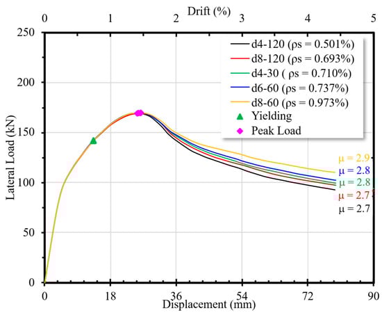 Figure 13 illustrates the influence of the confinement ratio on the ductility of five specimens of spun pile connection without a steel jacket. The confinement ratio is calculated by considering the contribution of spiral reinforcement to the concrete infill. All specimens have similar reinforcement, which is 8 mm in diameter with 75 mm spacing. The ratio is varied from 0.501% to 0.973%. As shown, the ratio affects the post-peak behavior of the connection. The force–displacement curve shows a more gradual decline in specimens with higher levels of confinement. Meanwhile, the piles with limited confinement experience a more drastic strength reduction. Adequate confinement helps the concrete reach its confined compressive strength (f’cc), preventing a sudden loss of strength at higher deformation levels. This influences the ductility of the connection, although its effect is not significant, as the ductility values remain relatively similar, ranging from 2.7 to 2.9.