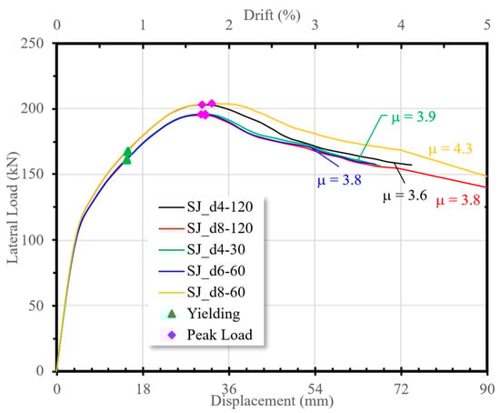 Figure 14 illustrates the behavior of the connection with an identical confinement configuration, supplemented by a steel jacket with 7 mm thickness. As described earlier, the presence of the steel jacket slightly enhances the confinement ratio of the connection. However, the crucial role of the steel jacket is to prevent spalling of the concrete cover. The steel jacket is assumed to be perfectly bonded. The jacket provides external confinement to the spun pile, allowing it to sustain post-peak deformation more effectively without a significant loss of strength. As observed, the strength degradation in the spun pile with a jacket is more gradual compared to the spun pile without a steel jacket, as shown in Figure 12. The ductility of the connection with a steel jacket increases to a range of 3.6–4.3 from 2.7–2.9 for those without a steel jacket. It implies that the steel jacket improves ductility significantly.