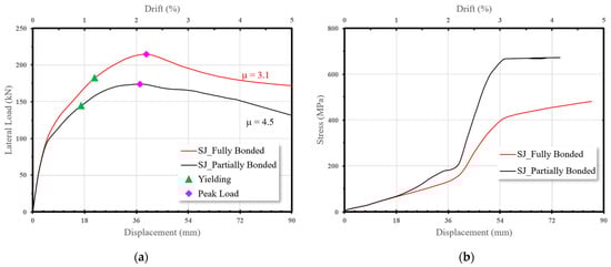 Figure 15, Figure 16 and Figure 17 illustrate the role of the steel jacket as transverse reinforcement. In the fully bonded condition, the steel jacket provides better confinement, thereby reducing the stress demand on the spirals located within the jacketed region. With perfect bonding, the stirrups remain below their yield stress as shown in Figure 15b and Figure 16. The fully bonded condition improves the strength of the connection, as the spun pile behaves as a composite section and the steel jacket contributes more effectively as longitudinal reinforcement. The steel jacket develops yielding and eventually fractures, as shown in Figure 17. However, due to the brittle nature of high-strength steel, this mechanism also leads to a pronounced post-peak strength reduction. Consequently, the ultimate displacement (du) decreases, resulting in a less ductile response compared with the partially bonded condition. These findings suggest a trade-off in design: while full bonding enhances strength, it may compromise ductility, and thus the choice between fully and partially bonded configurations should be made according to the desired balance between strength and deformability.