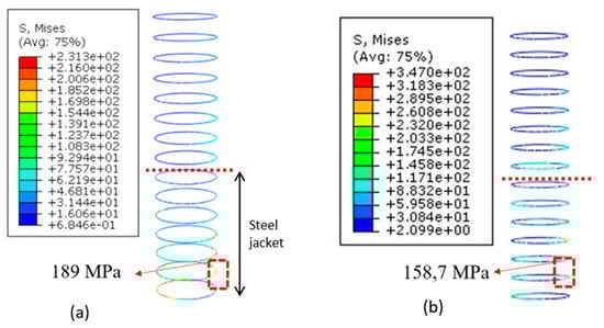 Stress contour of (a) prestress wire and (b) steel jacket.