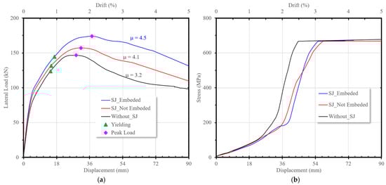 The connection with an embedded steel jacket has a ductility value of 4.5, whereas the non-embedded steel jacket has 4.1. Meanwhile, the connection without a steel jacket has a ductility value of only 3.2. Referring to the stress development of the stirrups located at the bottom shown in Figure 15b, it can be seen that all three FE models are able to reach the yield stress. However, the steel jacket delays the occurrence of yielding of the stirrups compared to the connection without a steel jacket. Therefore, the presence of a steel jacket increases the ductility since it is calculated as the ratio of the maximum displacement to the yield displacement.