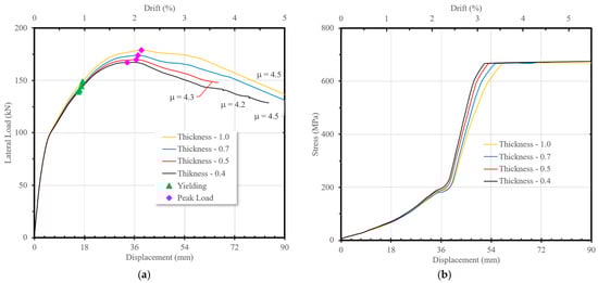 The effect of variation in thickness of the steel jacket on (a) the load–displacement curve and (b) the stress development of the bottom stirrup of the spun pile.