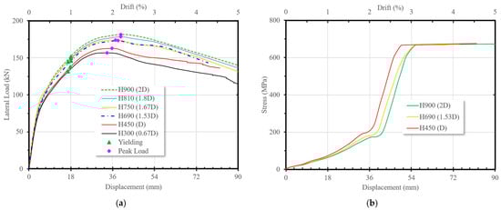 Figure 20 illustrates the effect of steel jacket height, expressed as a ratio to the pile diameter (D), on the load–displacement response. In the analysis, the steel jacket was assumed to be embedded 100 mm into the pile cap, consistent with the experimental arrangement under fully bonded conditions. An increase in jacket height enhanced the connection capacity; however, the improvement became negligible once the height exceeded 1.53D. Figure 20b shows the stress development in the stirrups located at the bottom of the spun pile, indicating that a greater jacket height delayed the onset of yielding.