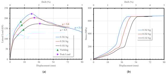 As previously mentioned, an axial load equivalent to 0.1 f’cAg was applied in the experiment to simulate the typical axial load sustained by spun piles under real conditions. According to ASCE provisions, the required confinement in column structures is affected by the magnitude of axial load. In this study, the effect of axial load on the behavior of spun piles was considered as one of the key parameters. Figure 21 presents the effectiveness of the steel jacket for axial load variations of 0.1 f’cAg, 0.2 f’cAg, and 0.3 f’cAg. From the figure, it can be observed that the axial load significantly affects the strength and the ductility of the connection. As the axial load increases, the ductility of the connection decreases. Earlier yielding of the stirrups is observed when the axial load applied to the spun pile is higher.