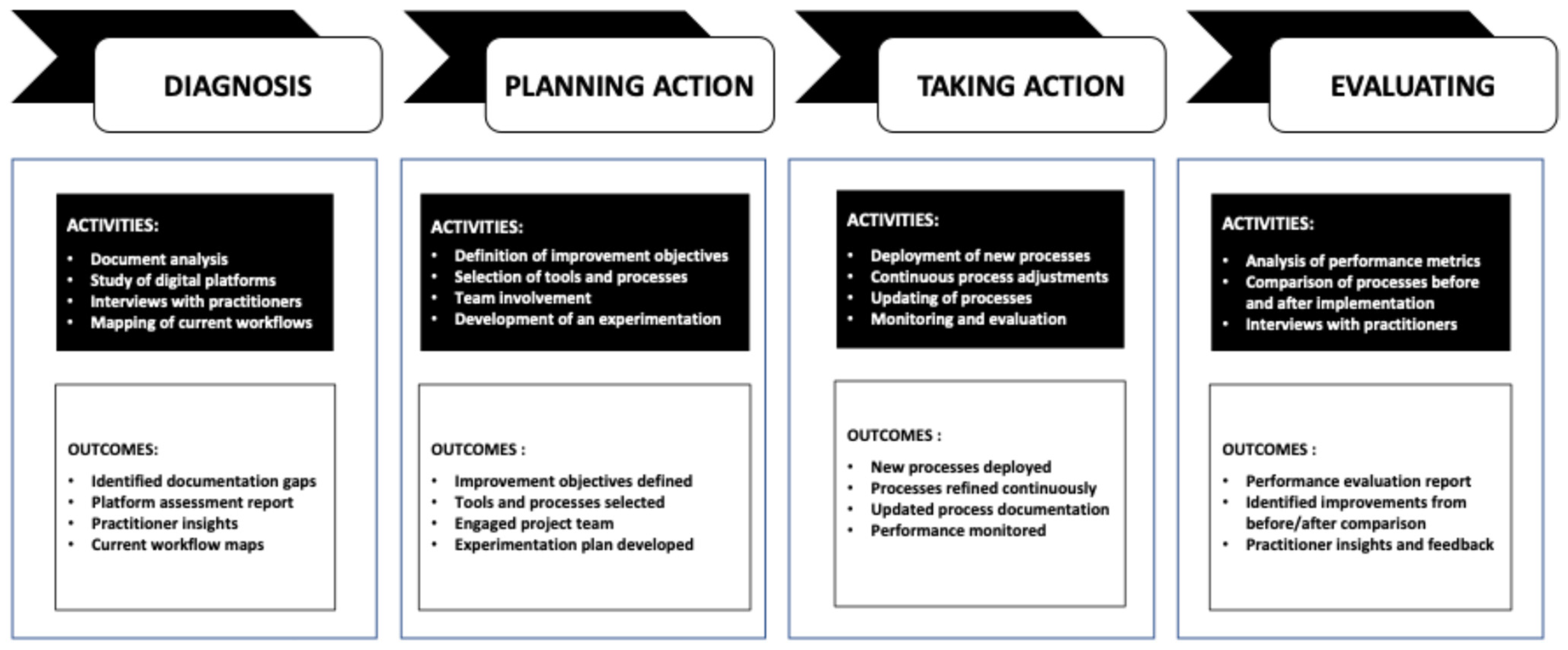 - Progressive deployment: Finally, the experimentation was deployed progressively. Initially, for processes involving the construction team, a construction site was selected as the “pilot” site, due to the advanced state of its works. For other processes, a group of individuals was selected to test with participants who were expected to use the process. Next, for the construction processes, the experimentation was extended to another construction site, stemming from another contract, in order to test the processes in a different operational context while maintaining a monitoring logic. The second site was selected based on three main criteria: (1) the use of a CDE platform that was actively adopted by project stakeholders, (2) the involvement of multiple disciplines requiring intensive coordination, and (3) the availability and willingness of the project team to participate in interviews and provide access to project data. This complementary case allowed us to strengthen the robustness of the analysis and demonstrate the broader applicability of the framework. For the remaining processes, the group of individuals concerned was expanded. Finally, a phase of generalization to all sites and all relevant personnel on the project was initiated, based on the adjustments derived from the initial feedback. This progressive deployment allowed for the approach to be secured and for identified gaps to be corrected in real time.